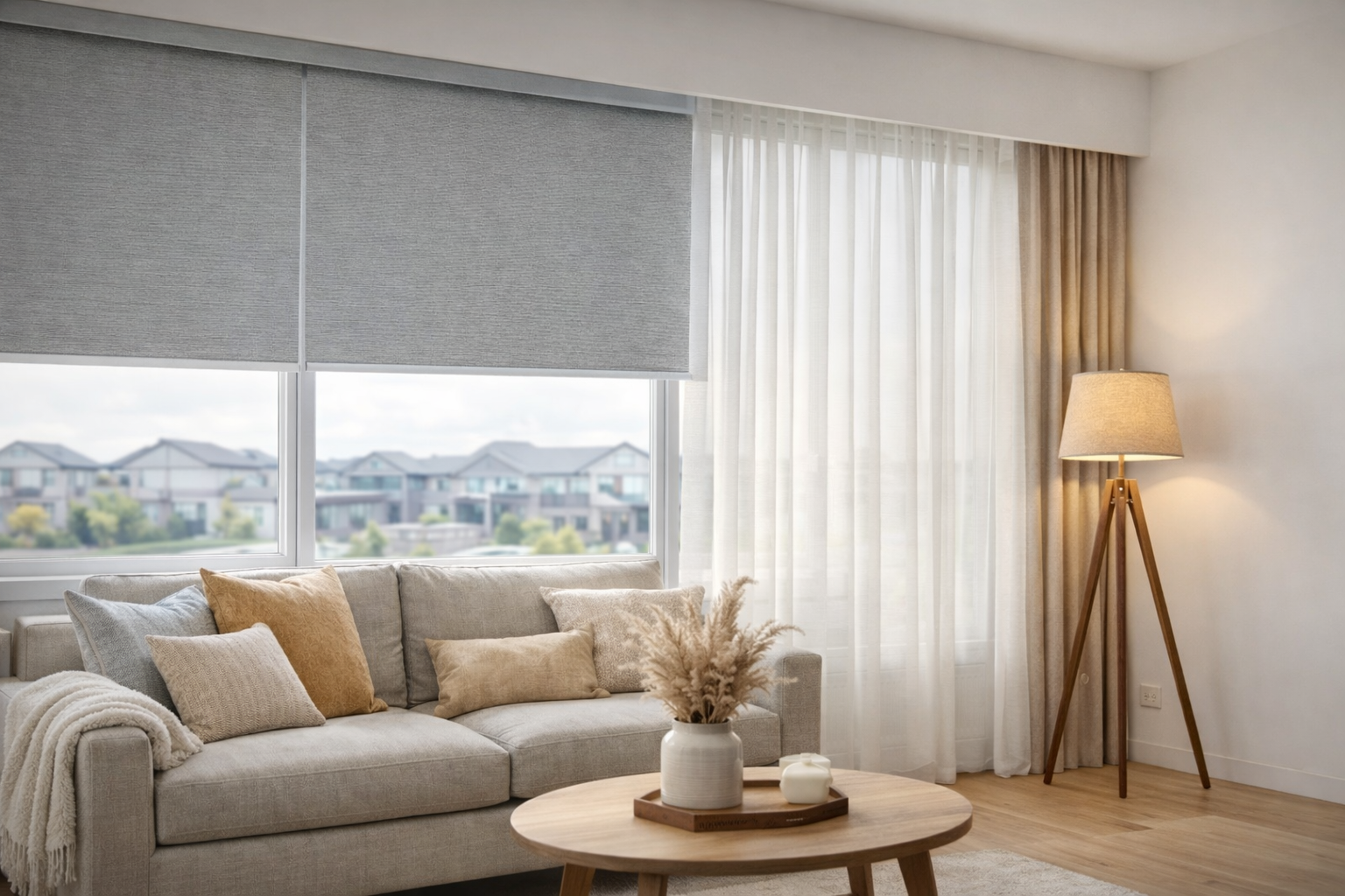 Living areas benefit from light-filtering roller blinds that allow natural light to enter while reducing glare and maintaining privacy.