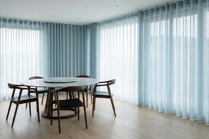In this installation, the sheer fabric acts as a diffusers for the harsh Australian sun, reducing glare on TV screens and protecting furniture from UV fading. The result is a bright, airy sanctuary that feels open yet completely private.